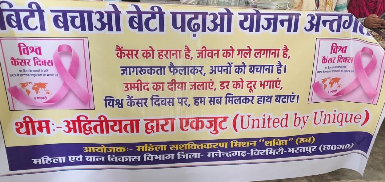 मो.फारूक की रिपोर्ट एमसीबी/03 फरवरी 2026/ जिले में विश्व कैंसर दिवस के अवसर पर बालिकाओं में स्वास्थ्य के प्रति जागरूकता एवं कैंसर की रोकथाम विषय पर विशेष कार्यक्रम का आयोजन किया गया। संचालनालय महिला एवं बाल विकास छत्तीसगढ़, इन्द्रावती भवन नवा रायपुर द्वारा जारी निर्देशों के अनुरूप बेटी बचाओ बेटी पढ़ाओ योजना अंतर्गत 01 से 10 फरवरी 2026 तक जागरूकता कार्यक्रम आयोजित किए जा रहे हैं। इसी क्रम में आज 03 फरवरी 2026 को शासकीय हाई स्कूल भल्लौर में जागरूकता कार्यक्रम संपन्न हुआ। भारत सरकार की महत्वाकांक्षी योजना बेटी बचाओ बेटी पढ़ाओ के अंतर्गत जिला कलेक्टर डी. राहुल वेंकट के निर्देशानुसार तथा जिला कार्यक्रम अधिकारी आदित्य शर्मा के मार्गदर्शन में महिला एवं बाल विकास विभाग के महिला सशक्तिकरण केंद्र के माध्यम से यह कार्यक्रम आयोजित किया गया। कार्यक्रम का मुख्य उद्देश्य किशोरी बालिकाओं को कैंसर जैसी गंभीर बीमारी के प्रति जागरूक करना तथा इसके कारण, लक्षण, बचाव एवं उपचार के संबंध में आवश्यक जानकारी प्रदान करना रहा। कार्यक्रम के दौरान बालिकाओं को बताया गया कि संतुलित आहार, समय पर भोजन, पर्याप्त पानी का सेवन एवं नियमित दिनचर्या अपनाकर अनेक बीमारियों से बचा जा सकता है। कैंसर से बचाव के लिए नशीले पदार्थों से दूरी बनाए रखने पर विशेष जोर दिया गया तथा बालिकाओं को यह भी प्रेरित किया गया कि वे अपने परिवार एवं आसपास के लोगों को नशे के दुष्परिणामों के प्रति जागरूक करें। बालिकाओं के स्वास्थ्य, एनीमिया की रोकथाम एवं शारीरिक कमजोरी से बचाव के उपायों की जानकारी भी विस्तार से दी गई। परीक्षा का समय निकट होने के कारण विद्यार्थियों पर बढ़ते मानसिक दबाव को ध्यान में रखते हुए उन्हें अपने स्वास्थ्य का विशेष ध्यान रखने, सही खान-पान अपनाने और सकारात्मक सोच बनाए रखने के लिए प्रोत्साहित किया गया। किशोरी बालिकाओं को मासिक धर्म के दौरान स्वच्छता, सेनेटरी पैड के सही उपयोग, मासिक धर्म में अनियमितता, चुप्पी तोड़ो खुलकर बोलो अभियान तथा समय-समय पर स्वास्थ्य जांच की आवश्यकता के बारे में भी जागरूक किया गया। कार्यक्रम में महिला एवं बाल विकास विभाग द्वारा संचालित विभिन्न योजनाओं की जानकारी भी प्रदान की गई। बालिकाओं को नवा बिहान, सखी वन स्टॉप सेंटर 181, चाइल्ड हेल्पलाइन 1098, नोनी सुरक्षा योजना, महतारी जतन, महतारी वंदन, मातृ वंदन योजना, महिला कोष, कन्या विवाह योजना, पालना योजना, सीडब्ल्यूसी एवं जेजेबी जैसी महत्वपूर्ण योजनाओं के उद्देश्य एवं लाभों से अवगत कराया गया। Post navigation ग्राम पंचायतों में विकसित भारत जी-राम-जी योजना का प्रचार-प्रसार अंजन हिल कोयला खदान परियोजना की जनसुनवाई संपन्न, स्थानीय प्रतिनिधियों ने जताया समर्थ