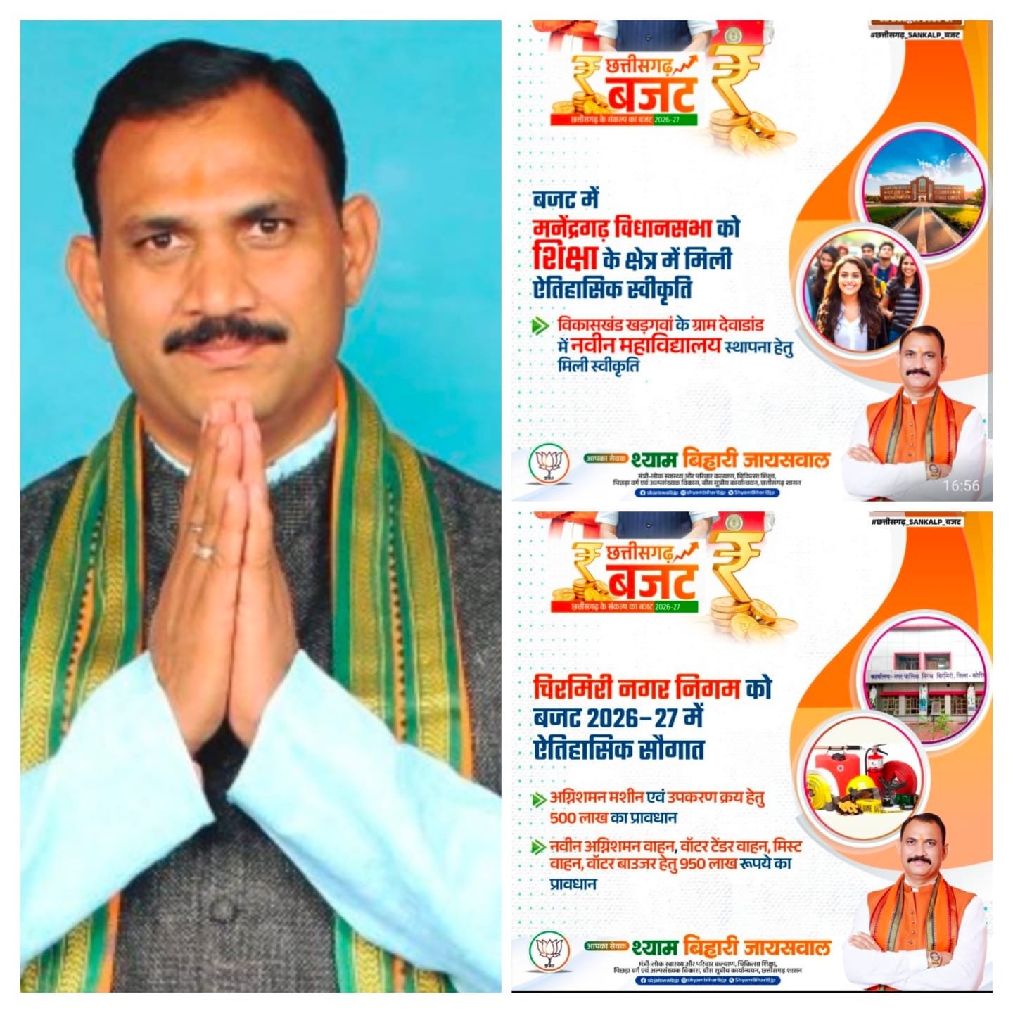 मो.फारूक की रिपोर्ट चिरमिरी में हाईटेक अग्निशमन, देवाड़ांड में नया महाविद्यालय, मनेंद्रगढ़ में मेडिकल विस्तार और खड़गवां में सिंचाई क्रांति स्वास्थ्य मंत्री श्याम बिहारी जायसवाल बोले — यह बजट विकास का रोडमैप एमसीबी। मनेंद्रगढ़। चिरमिरी। खड़गवां। मुख्यमंत्री विष्णुदेव साय के नेतृत्व में प्रस्तुत संकल्प बजट 2026-27 ने मनेन्द्रगढ़-चिरमिरी-भरतपुर (एमसीबी) जिले को ऐतिहासिक सौगात दी है। बजट प्रस्तुतीकरण के बाद सामने आए स्वास्थ्य मंत्री श्याम बिहारी जायसवाल ने बताया कि यह केवल बजटीय घोषणा नहीं, बल्कि क्षेत्र के समग्र विकास का ठोस खाका है। उन्होंने कहा कि नगरीय सुरक्षा, स्वास्थ्य, शिक्षा, सिंचाई और आधारभूत संरचना के क्षेत्र में अभूतपूर्व प्रावधान किए गए हैं। जिससे ना सिर्फ एमसीबी जिले का समग्र विकास निहित होगा बल्कि जनअपेक्षाओं के अनुरूप विधानसभा मनेंद्रगढ़ विकास के नए सोपान का स्वाद भी चखेगा, यह पूरा बजट 2047 के अनुरूप विकसित भारत, विकसित छत्तीसगढ़, विकसित विधानसभा को लेकर है। श्री जायसवाल ने मनेंद्रगढ़, खड़गवां और चिरमिरी को लेकर आंकड़ेवार जानकारी दी, उन्होंने बताया कि बजट में चिरमिरी, मनेंद्रगढ़, खड़गवां समेत एमसीबी जिले को क्या क्या मिला है? *नगर निगम चिरमिरी को क्या मिला?* *अग्निशमन सशक्तिकरण* अग्निशमन मशीन एवं उपकरण खरीदी – ₹500 लाख तथा नवीन फायर वाहन, वॉटर टेंडर, मिस्ट वाहन, वॉटर बाउजर के लिए ₹950 लाख रुपए की स्वीकृति प्राप्त हुई है। *स्वास्थ्य* जिला चिकित्सालय चिरमिरी को 200 बिस्तरीय अस्पताल के रूप में (129 पद) की स्वीकृति मिली है। *नगरीय विकास* वार्ड 20 में ऑडिटोरियम – ₹550 लाख, गौरव पथ निर्माण (अटल परिसर से लोको पुलिया) – ₹280 लाख, वार्ड 16 गौरव पथ – ₹790 लाख से विभिन्न सड़क सुदृढ़ीकरण कार्य जिससे चिरमिरी में नगरीय सुरक्षा और शहरी अधोसंरचना को आधुनिक रूप मिलेगा। *मनेंद्रगढ़ को मिला* *सड़क एवं अधोसंरचना* मनेंद्रगढ़-केल्हारी-जनकपुर राज्य मार्ग चौड़ीकरण – ₹6000 लाख, केवई नदी–हसदेव नदी लिंक परियोजना – ₹4300 लाख, हसदेव बैराज निर्माण – ₹3000 लाख, बेलबहरा-फिशफार्म मार्ग – ₹400 लाख, एनएच-43 से एकलव्य आश्रम मार्ग – ₹200 लाख रुपए स्वीकृत। *स्वास्थ्य के क्षेत्र में* नवीन शासकीय मेडिकल कॉलेज में 100 पद, अतिरिक्त 248 पदों की स्वीकृति, नवीन नर्सिंग कॉलेज में 42 पद, नर्सिंग कॉलेज भवन – ₹900 लाख, भरतपुर CHC का 100 बिस्तरीय सिविल अस्पताल में उन्नयन – ₹1900 लाख रुपए है। *शिक्षा व प्रशासन* 250 सीटर सेंट्रल लाइब्रेरी (नालंदा परिसर) – ₹441.49 लाख, संयुक्त संभागीय कार्यालय भवन – ₹70 लाख, न्यायिक अधिकारियों के आवास – ₹715.96 लाख। पुलिस अधीक्षक कार्यालय, सिटी कोतवाली, अग्निशमन भवन जो कि मनेंद्रगढ़ जिला मुख्यालय के रूप में स्वास्थ्य और प्रशासनिक ढा